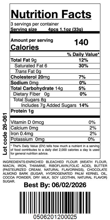 Enriched wheat flour, butter, sugar, chocolate almond bark.